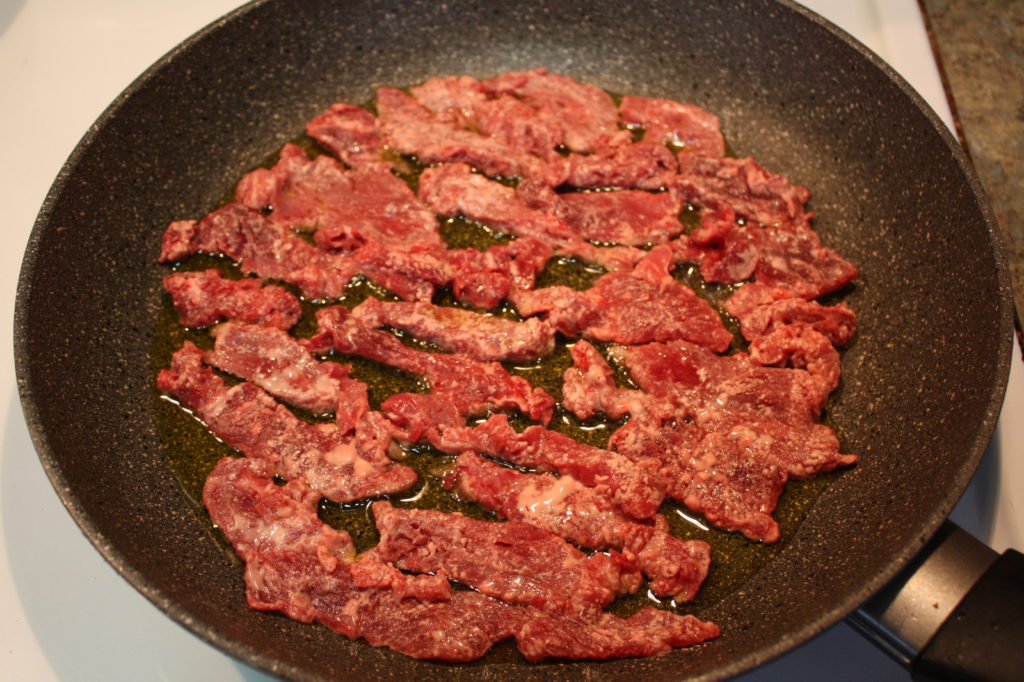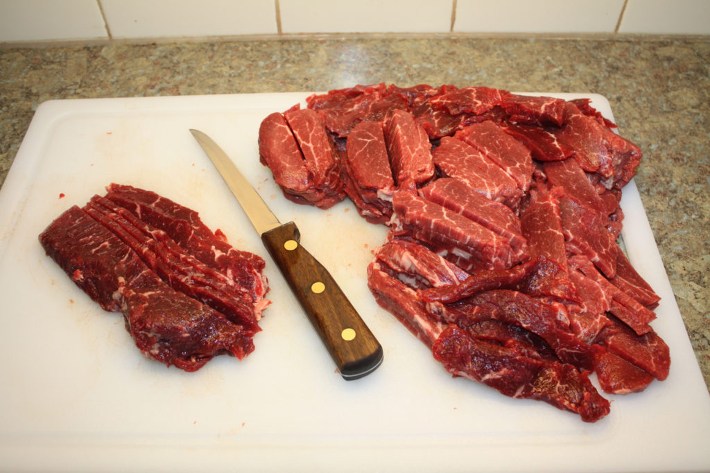 Cut your meat into 1/4 inch thick strips. I find it easier to cut the meat into thin strips when it is still partially frozen.