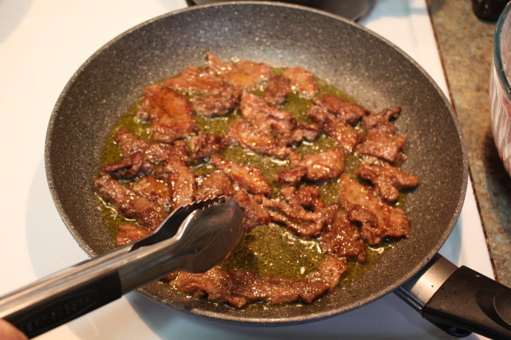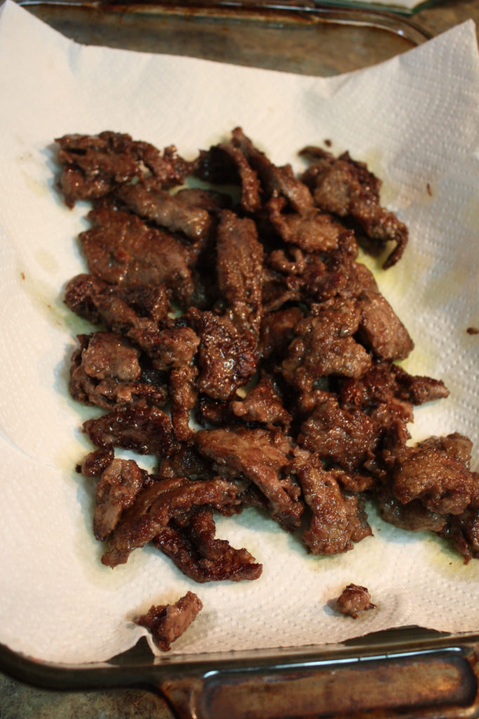 Fry until the edges become crisp and start to brown, then flip over with tongs or a fork to let the other side brown. Sometimes when the oil really heats up it splatters, so when I am reloading the skillet with beef I sometimes set the skillet off the burner so it won’t splatter me so much. Ouch!