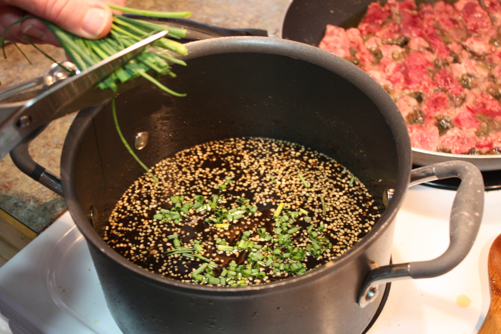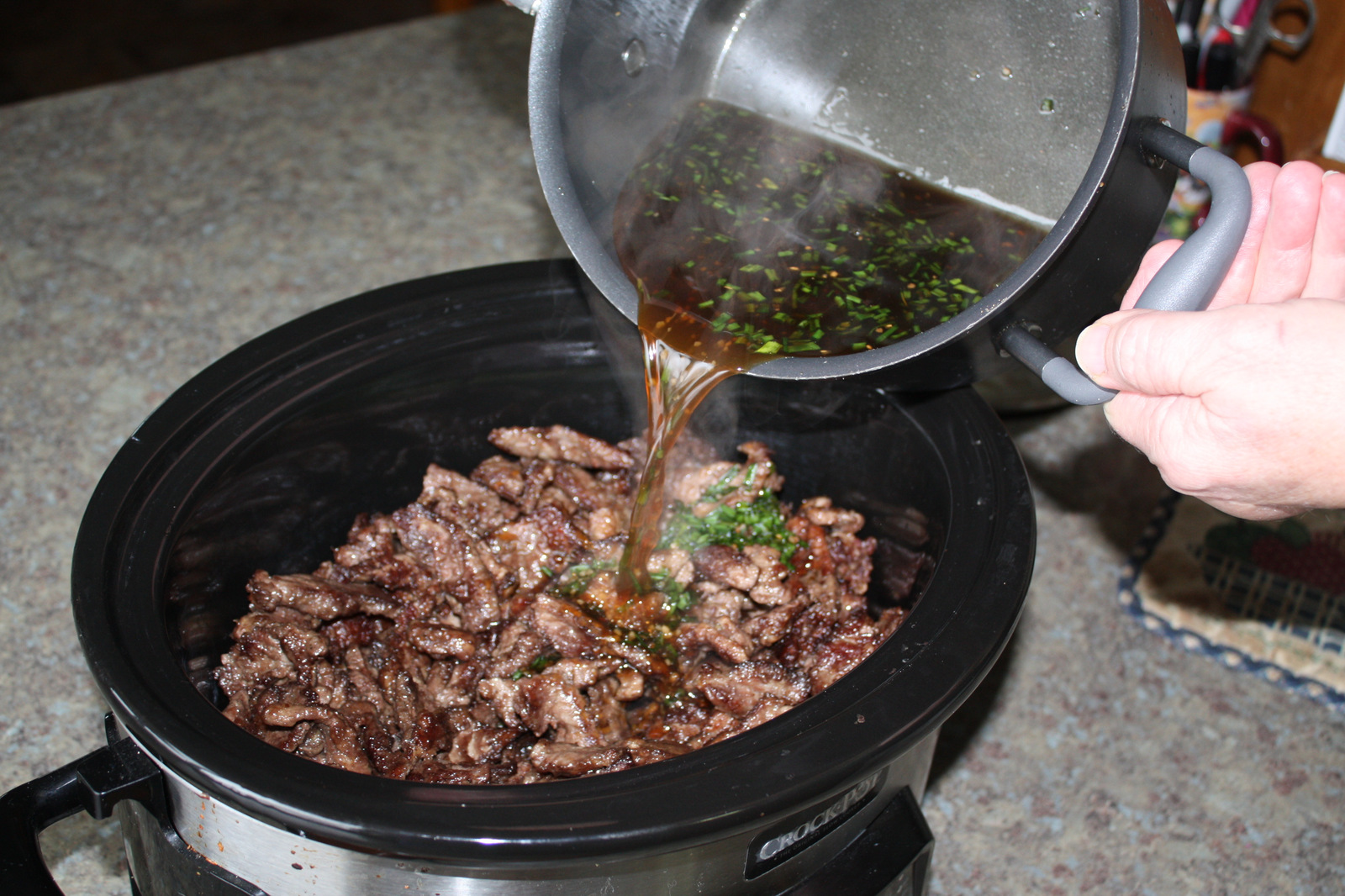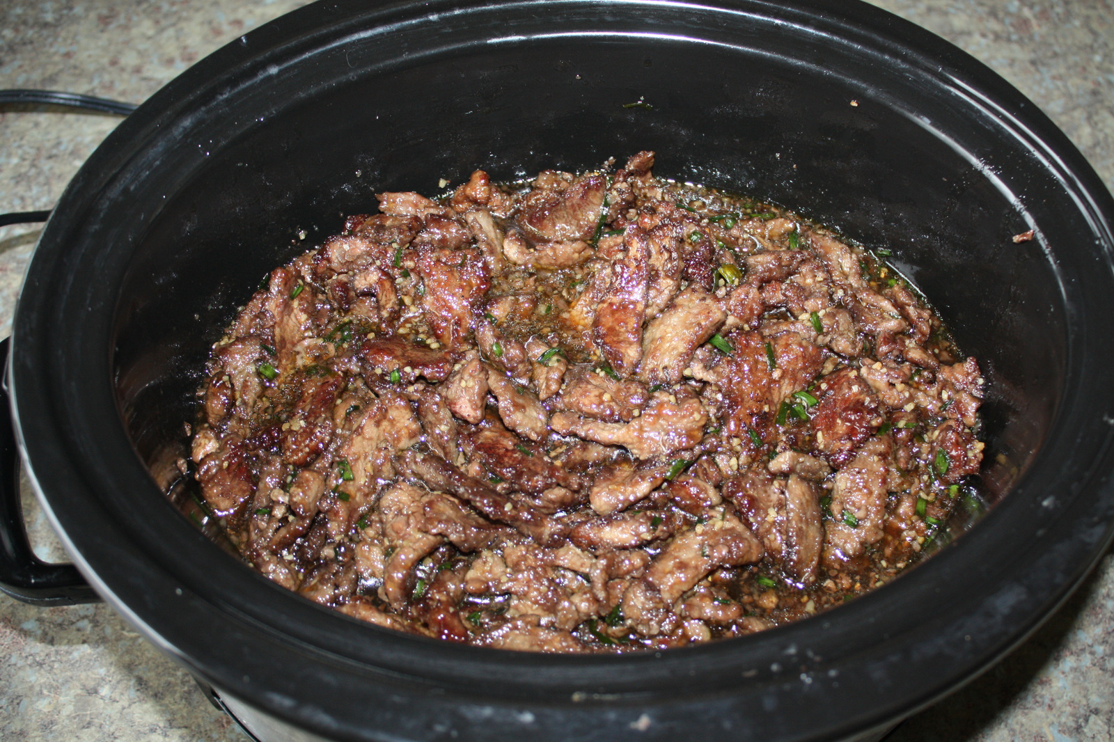 Pour the oil out of the skillet or wok, and return the pan to medium heat. Return the beef slices to the pan and pour in the reserved sauce. Stir to combine. Heat to desired warmth and serve over rice. On the day I was cooking this, we had a meeting for the development of this website which ran close to dinner time, so I actually made everything in the early afternoon and just put the meat into a crock pot. I then poured the sauce over the top of the meat and stirred it together. I set the crock pot on the keep warm setting and ran off to our meeting.